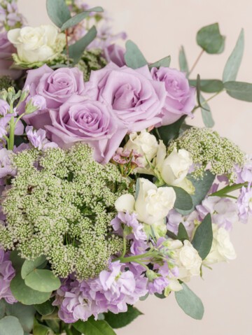 We love the color purple. Not only do we design unique purple rose arrangements, but your recipient will receive their flowers in our signature pink box. Inside are the roses, kept fresh in a container of water, covered with delicate tissue paper and sprinkled with rose petals. You can also include a note or picture if you choose. Once the box is sealed, we attach a single rosebud. Opening the box is almost as enjoyable as the gorgeous lavender roses held inside.