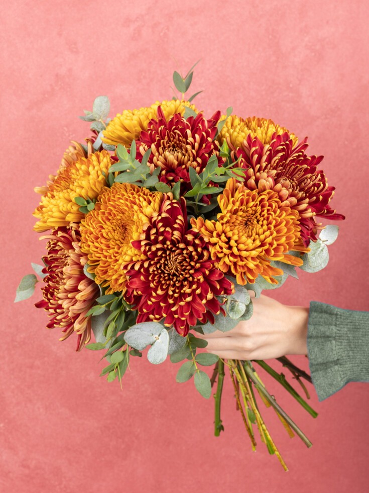 Flowers: Bronze and Rusty Chrysanthemums, Snapdragons, Calla Lilies, Queen Anne's Lace and Eucalyptus