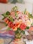 Flowers: Orange and Peach Roses, Carnation, Spray Rose, Snapdragon, Tulip, and Greenery