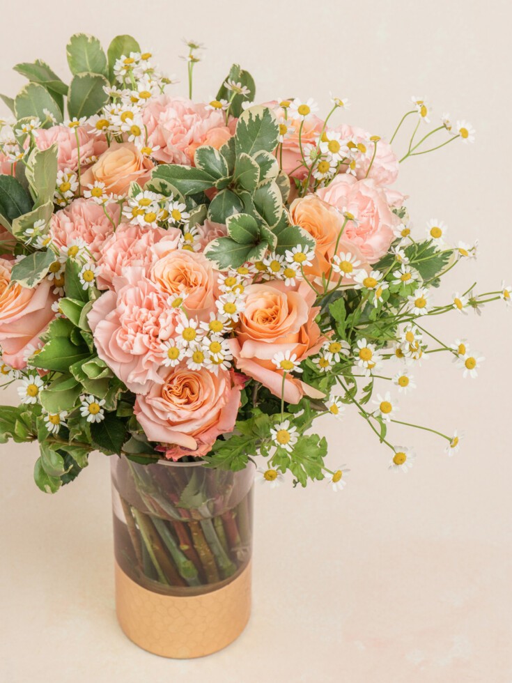 Capucine gathers roses, warm seasonal blooms, and lush greenery into a generous, rounded bouquet. Radiant and inviting, it evokes long afternoons in late spring light.