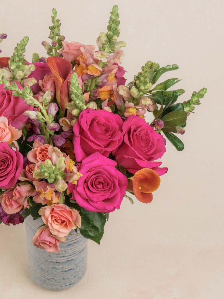 This bouquet is delivered in our signature 16″ gift box in NYC, Chicago, Los Angeles, Austin, Miami, and Washington, DC. For nationwide orders, we use an overnight shipping box designed to keep flowers fresh and secure. Each bouquet is wrapped in a water-filled sleeve and topped with soft tissue for protection. Your personal message is printed on our illustrated card and tucked neatly inside, along with any vase or extra gift.