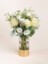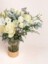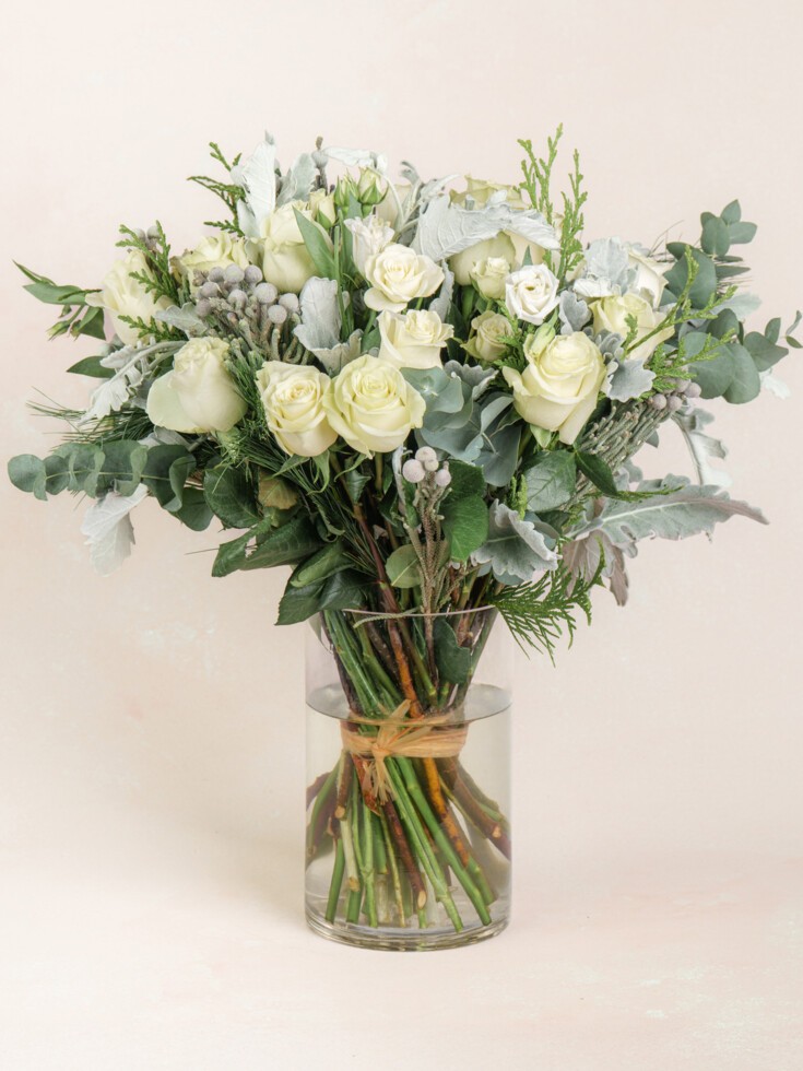 Flowers: White Mondial Rose, Lisianthus, Spray Rose, Silver Brunia, Dusty Miller, and Holiday Greens