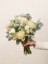 Flowers: White Mondial Rose, Lisianthus, Spray Rose, Silver Brunia, Dusty Miller, and Holiday Greens