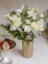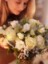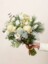 Flowers: White Mondial Rose, Lisianthus, Spray Rose, Silver Brunia, Dusty Miller, and Holiday Greens