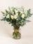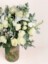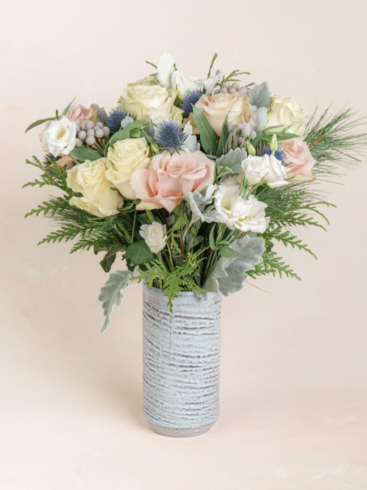 Flowers: White Mondial Rose, Lisianthus, Spray Rose, Silver Brunia, Dusty Miller, and Holiday Greens