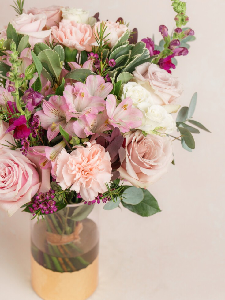 This arrangement will be hand-delivered in a glass vase carefully wrapped in our Ode gift paper. We print your note on a gift card and tuck it securely to the side of the arrangement.