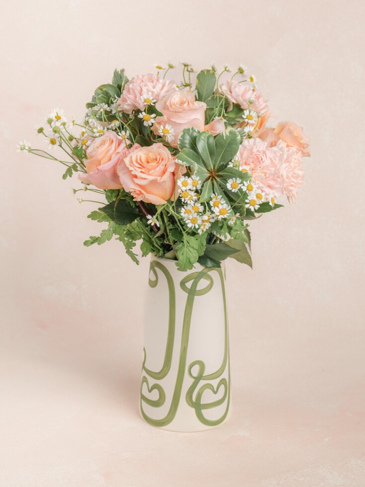 This bouquet is delivered in our signature 16″ gift box in NYC, Chicago, Los Angeles, Austin, Miami, and Washington, DC. For nationwide orders, we use an overnight shipping box designed to keep flowers fresh and secure. Each bouquet is wrapped in a water-filled sleeve and topped with soft tissue for protection. Your personal message is printed on our illustrated card and tucked neatly inside, along with any vase or extra gift.