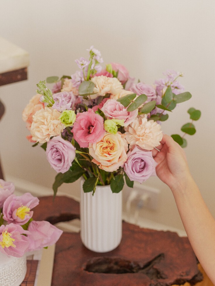 This bouquet is delivered in our signature 16″ gift box in NYC, Chicago, Los Angeles, Austin, Miami, and Washington, DC. For nationwide orders, we use an overnight shipping box designed to keep flowers fresh and secure. Each bouquet is wrapped in a water-filled sleeve and topped with soft tissue for protection. Your personal message is printed on our illustrated card and tucked neatly inside, along with any vase or extra gift.