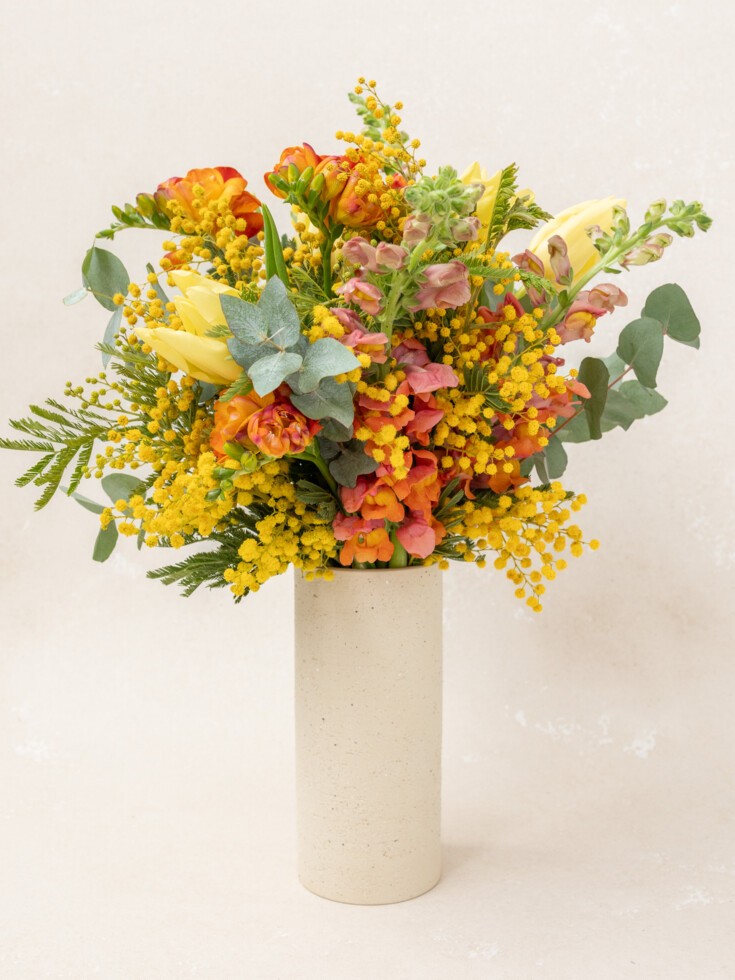 This bouquet is delivered in our signature 16″ gift box in NYC, Chicago, Los Angeles, Austin, Miami, and Washington, DC. For nationwide orders, we use an overnight shipping box designed to keep flowers fresh and secure. Each bouquet is wrapped in a water-filled sleeve and topped with soft tissue for protection. Your personal message is printed on our illustrated card and tucked neatly inside, along with any vase or extra gift.